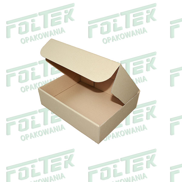 Pudełko fasonowe z wieczkiem zamykanym o wymiarach 380x240x70, wykonane z tektury trójwarstwowej, szarej. Pudełko w bardzo wygodny i szybki sposób składa się bez użycia taśmy klejącej.