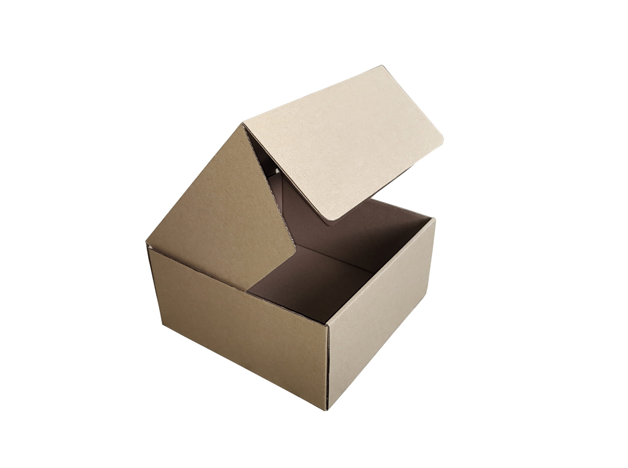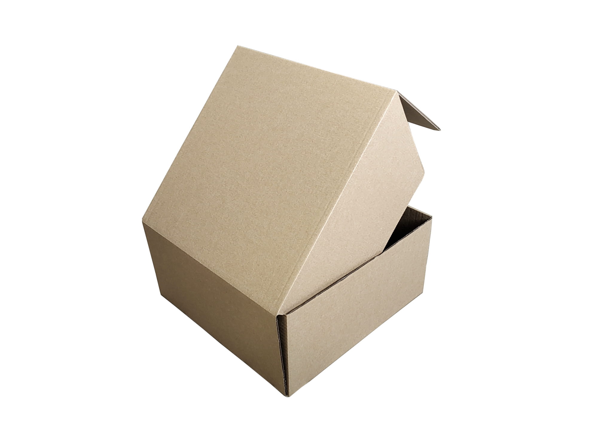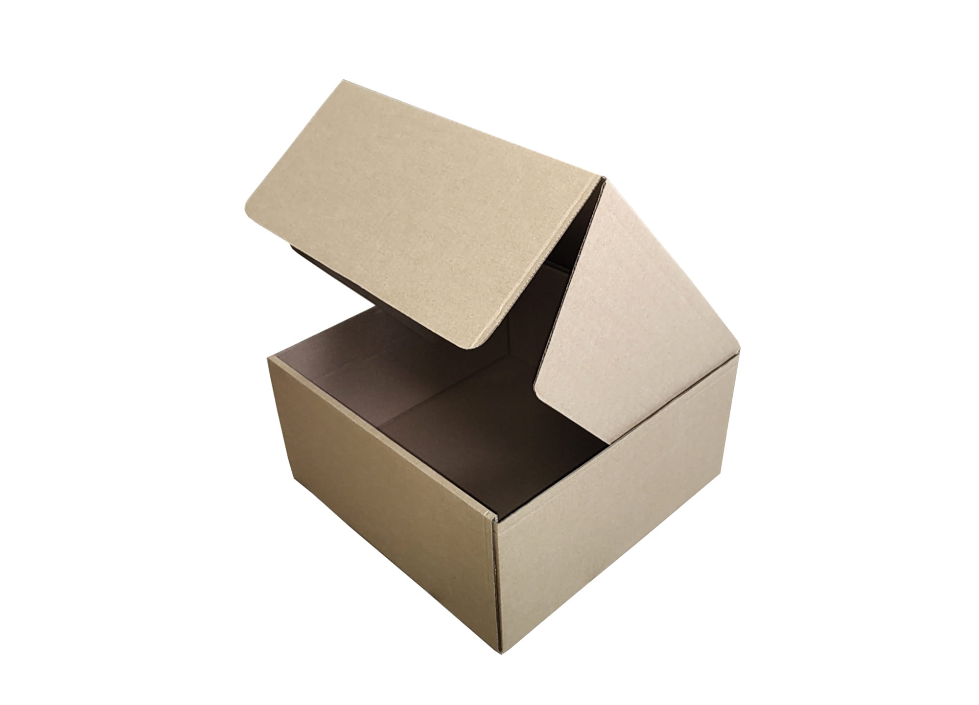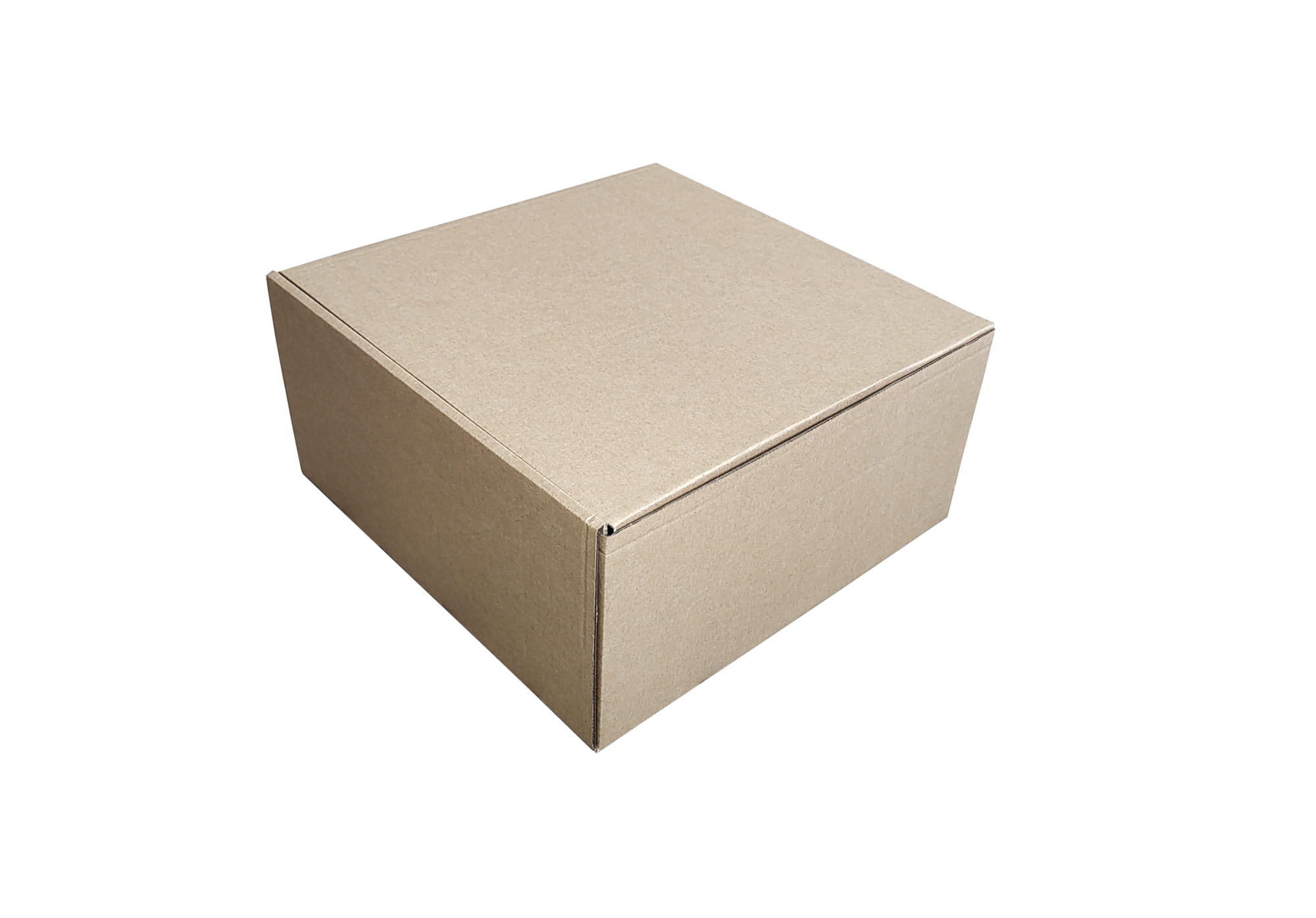 Pudełko fasonowe z wieczkiem zamykanym o wymiarach 380x380x80, wykonane z tektury trójwarstwowej, szarej. Pudełko w bardzo wygodny i szybki sposób składa się bez użycia taśmy klejącej.